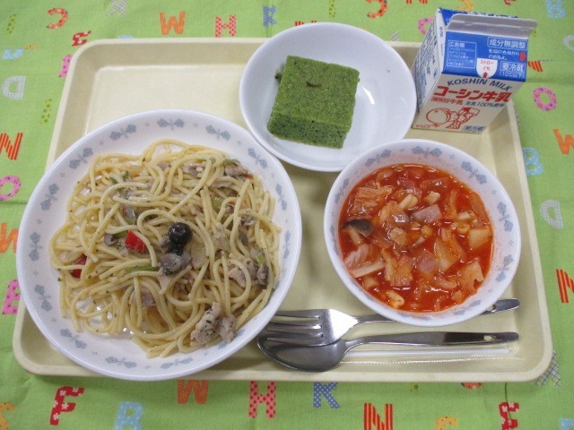 きのこのペペロンチーノ 豆入りミネストローネ 小松菜米粉ケーキ