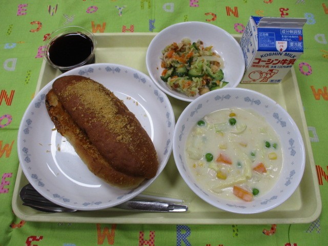 焼きピロシキ スパイシーツナサラダ 野菜とマカロニのコーンクリーム煮 グレープゼリー