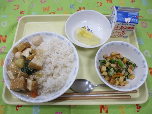 家常豆腐丼 揚げ大豆と茎わかめのサラダ りんご