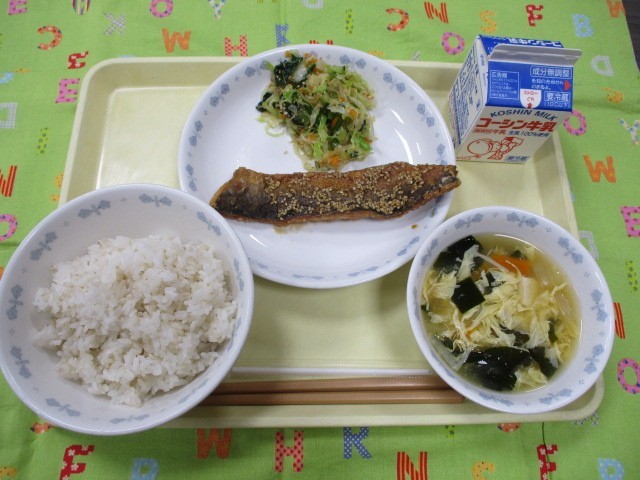 麦ごはん にしんのごまだれ揚げ しらすと野菜の和風サラダ 卵とわかめと豆腐の味噌汁