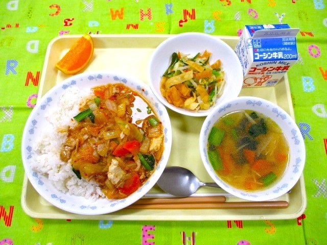 豚キムチ丼 サクサクワンタン中華サラダ 春雨入り中華スープ オレンジ