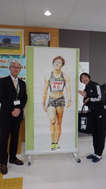 (2年生の生徒が描いてくれた等身大の寺田選手の絵でお出迎えしました!)