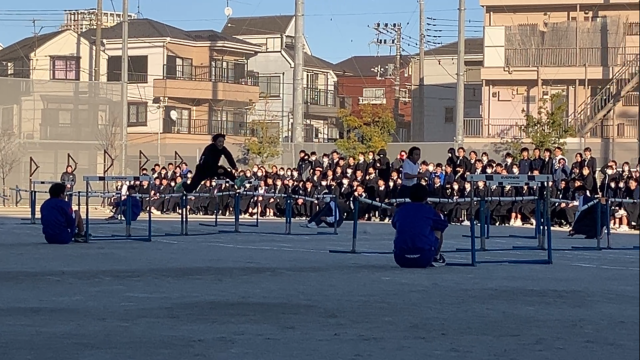 講演では「夢はかなう?」という題で、ご自身の半生をご紹介いただきながら、どうやって人生のハードルを乗り越えて来たのか、大変明るくわかりやすくお話しいただきました。生徒からのお悩み、質問にも答えていただき、これから色んなハードルを乗り越えていく生徒たちの励みになったと思います。今日は大変冷たい強風が吹いていたのですが、講演の後、代表生徒と一緒にハードル等の実演をしてくださいました。元オリンピック選手と間近で接することが出来、生徒達も大変な盛り上がりでした。