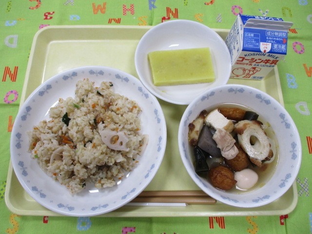 豚と根菜の混ぜご飯 おでん風煮込み 芋ようかん