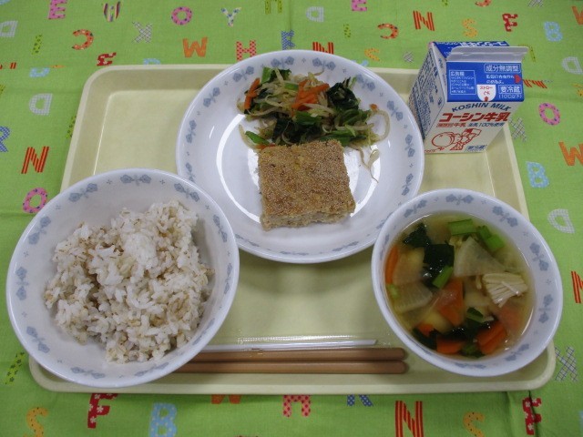 ごまごはん 松風焼き 野菜のおかか和え お雑煮風すまし汁