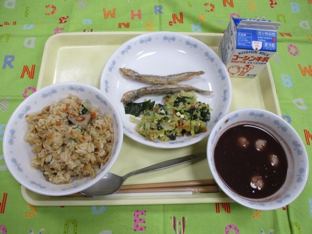 こぎつねごはん 豆アジのから揚げ チーズとツナの和風サラダ 白玉おしるこ