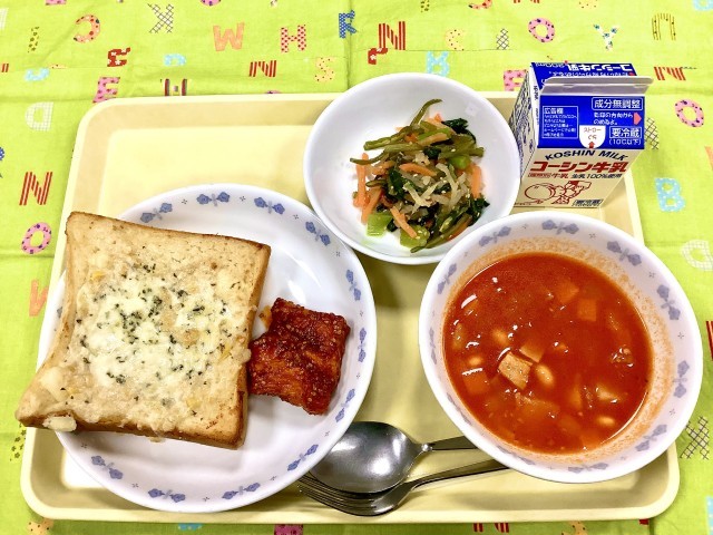 今日は3−4のリクエスト給食です。たらこポテマヨトースト、ヤンニョムチキン、ミネストローネがリクエストしてもらった給食です。3年生がこのメニューを食べるのは、おそらく最後になると思います。