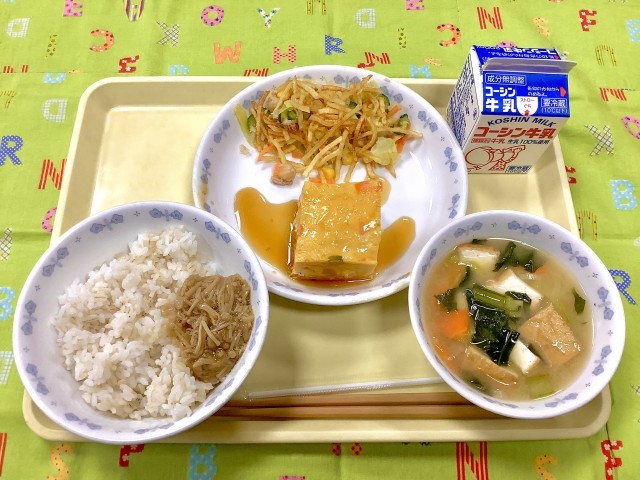 麦ごはん なめたけ 五目卵焼き甘酢あんかけ 揚げじゃが芋とツナの豆サラダ 生揚げと小松菜の味噌汁