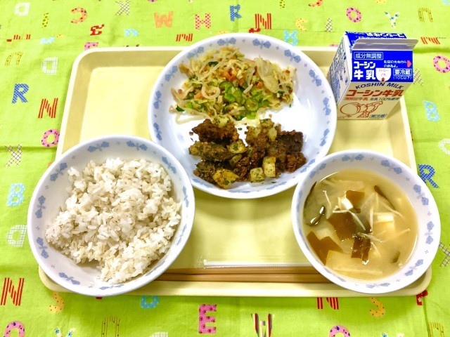 もち麦ご飯 豚レバーとじゃがいもの海苔塩風味 油揚げと野菜のアーモンドあえ 豆腐とえのきの味噌汁
