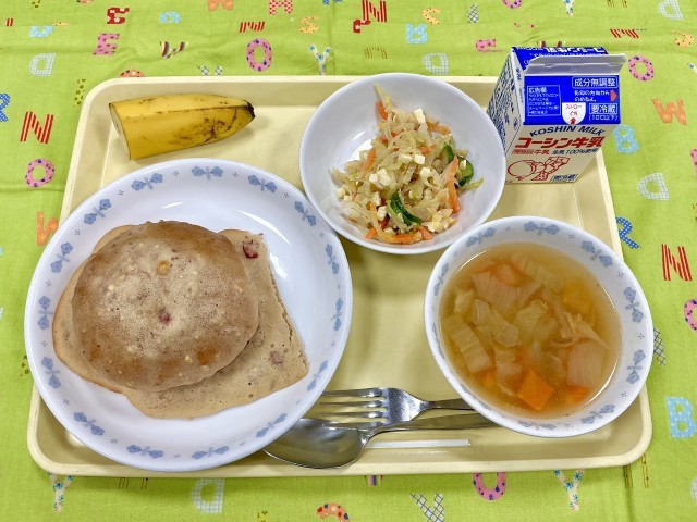 ストロベリービスキュイパン チーズキャベツサラダ 野菜たっぷりABCスープ バナナ