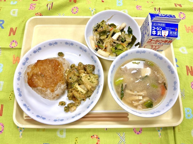 味噌焼きおにぎりは、一つ一つ手作業でおにぎりを握り、味噌を塗っているため、給食に出すことがちょっと難しい献立ですが、調理員さんがとても頑張ってくれたため、提供することができました。