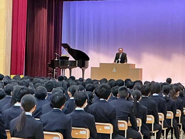今年度新しく着任された校長先生からは、「生徒も先生もワクワクする笑顔あふれる学校にしたい」とお話がありました。また「日々前進」毎日小さくていいので今日の努力を明日に繋げることの大切さを数学の話を交えてわかりやすく生徒にお話されました。