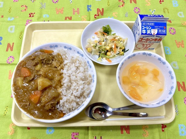 令和8年度初回の給食は、カレーライスにフルーツポンチと、子どもたちに人気のメニューです。初日から完食する1年生のクラスもありました。