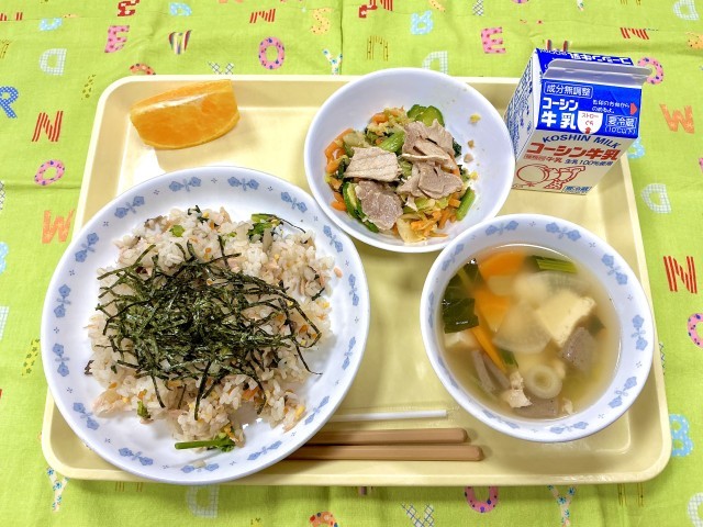 菜花と鮭のちらし寿司 豚しゃぶと野菜の和え物 野菜たっぷり白玉汁 しらぬい
