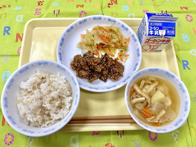 もち麦ごはん レバーのごまかりんとうがらめ 野菜のごまたくあん和え すいとん汁