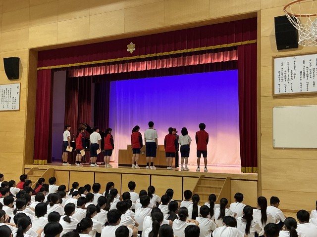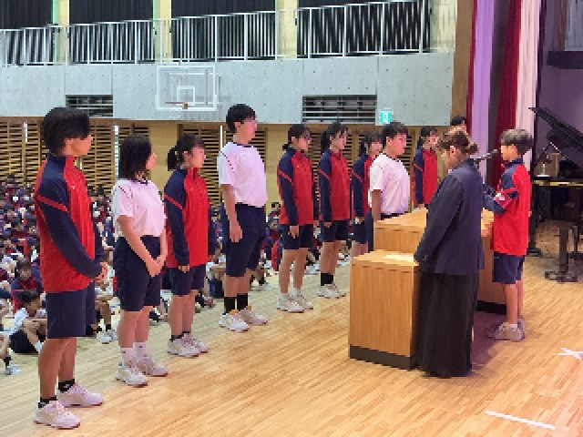 本日、朝礼で任命式を行いました。一人ひとりの呼名後、各委員長が壇上で任命証を渡されました。