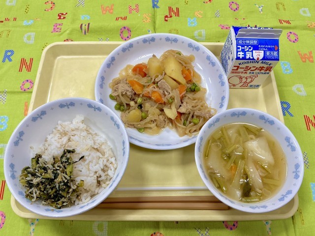 今日の給食は肉じゃがです。よく味が染み、ホクホクとした仕上がりになっています。野菜から水分が出たので、調理に水は使っておらず、野菜と肉旨みがよく出ています。