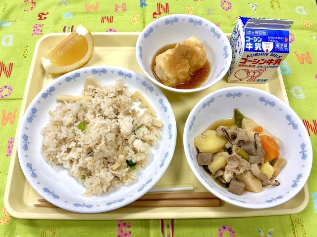 今日はたけのこごはんに、春の炊き合わせと春らしさ満点の献立です