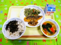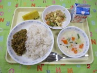 鶏とごぼう、人参、小松菜を混ぜたごはんです。ごぼうは給食室の鉄釜で炒めたり煮たりすると真っ黒になってしまうので、さっと下茹でしたり、ステンレス製の釜で調理して、色がかわらないよう気をつけなければならない食材の一つです。