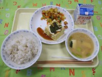 麦ごはん にしんのごまだれ揚げ しらすと野菜の和風サラダ 卵とわかめと豆腐の味噌...