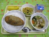 フィッシュドッグ カレー粉ふきいも マカロニサラダ 寒天入りフルーツポンチ 今日...