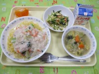 麦ごはん 五目卵焼き和風あんかけ キャベツのうま塩昆布和え 冬野菜のあったか汁 ...