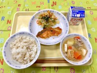 もち麦ごはん 魚の味噌マヨネーズ焼き 揚げ芋と野菜の和風サラダ 味噌すいとん汁 ...