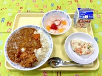 鶏からカレーライス ポテトサラダ ナタデココカルピス寒天ポンチ 今日は3−5のリ...