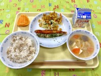 麦ごはん ヨシキリサメの唐揚げ 和風わかめサラダ 豆腐ともやしの味噌汁 ネーブル...