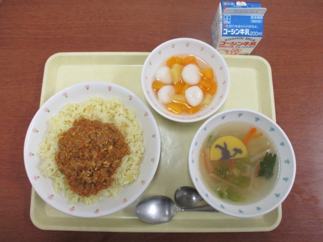 ・ドライカレー ・レタススープ ・白玉フルーツポンチ ・牛乳