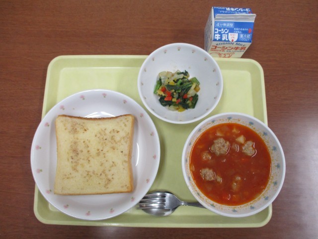 ・セサミトースト ・パプリカ入りサラダ ・ミートボールのトマト煮 ・牛乳
