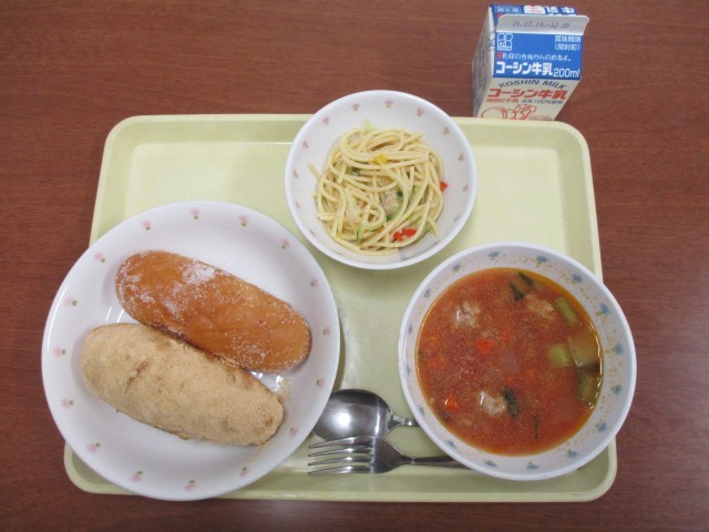 ・二色揚げパン(きなこ・砂糖) ・肉団子入りトマトスープ