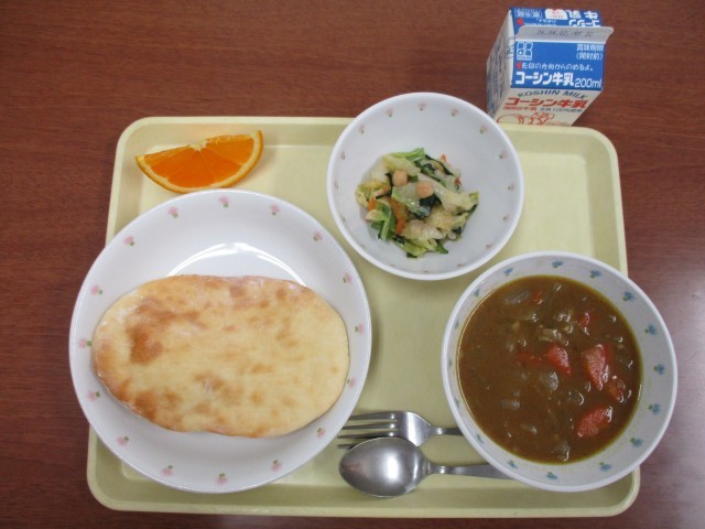・手作りナン ・カレーシチュー ・ひよこ豆のサラダ ・果物(清見オレンジ) ・牛乳