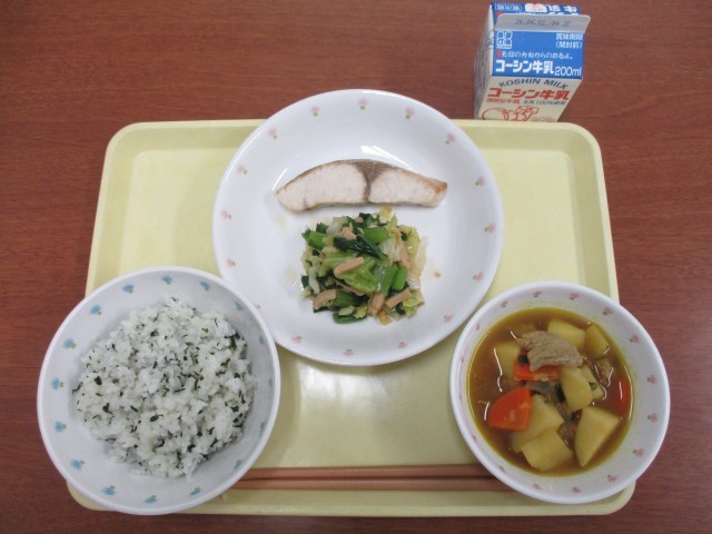 ・わかめご飯 ・しいらの塩麹焼き ・高野豆腐入りごまあえ ・じゃがいものカレー煮 ・牛乳