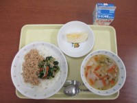 今日の給食の「豚肉五目丼」は、豚肉と共に、白菜、たけのこ、玉ねぎなどの野菜「白雪汁」は、削り節でとっただしに、大根のすりおろしやあられはんぺんを加えた優しい味の汁物です。えのきや小松菜も入り、野菜をたっぷりとることができます。