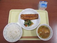 【献立】 麦入りご飯 鯖のうまだれ焼き 野菜のゆずあえ かぼちゃのすいとん 牛乳