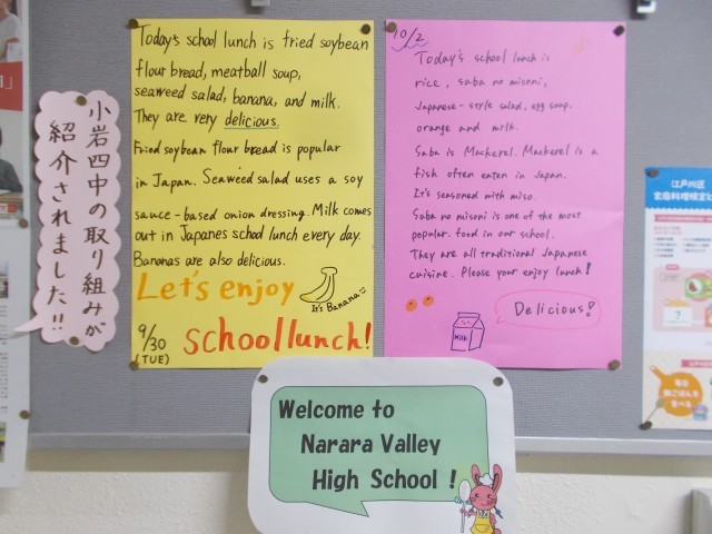 給食委員会では、この日のために給食の紹介文を英語で考えました。自分たちで考えた紹介文をいただきますの前にすこし苦戦しながらも英語で読み上げていました。和気あいあいと、四中の生徒たちと楽しい給食時間を過ごしてくれていました。