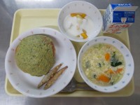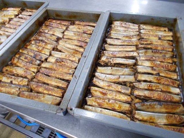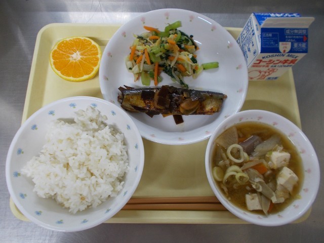 今日の主食は旬の魚、さんまを使った『さんまの筒煮』です。頭と尾を落としたさんまをスチームコンベクションオーブンを使って、朝から2時間じっくり煮ました。時間をかけて火にかけることで、骨まで柔らかくなり、小骨の多いさんまは苦手な生徒も多いですが、食べやすかったんではないかなと思います。昆布と生姜も入れて一緒に煮たので、ご飯のお供にもぴったりでした。「魚の昆布がたくさんほしいです!」とおかわりのリクエストしてくれる生徒もいました。