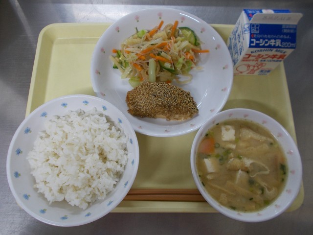 今日の給食の汁物は『呉汁』です。呉汁は宮城県の郷土料理です。大豆を水に浸し、すりつぶしたものを”呉”と言います。呉汁は、その呉をみそ汁に入れたものです。副菜のサラダは『ハリハリサラダ』です。切り干し大根の入った歯ごたえのあるサラダです。春雨も入っていたので、いつもよりボリュームがありましたが、生徒もよく食べてくれていました。