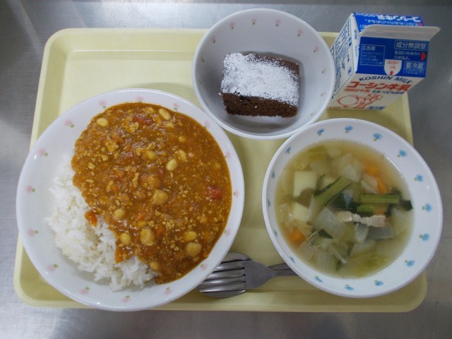 今日の給食の主食+主菜は『豆まめキーマカレー』です。豆はひよこ豆・大豆の2種類を入れました。トマト缶もたっぷり入れてよく煮込みました。ちょっといつもより辛みが強くて、辛そうにしている生徒もいました。