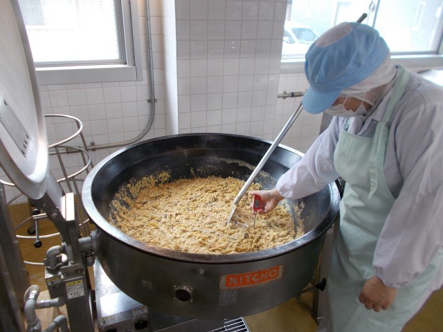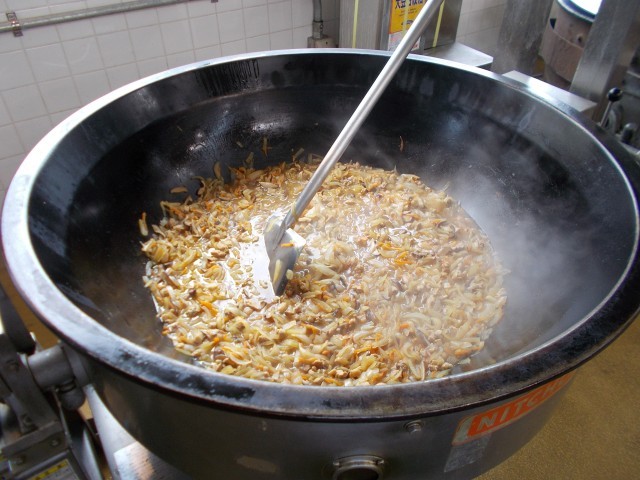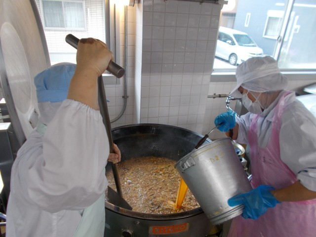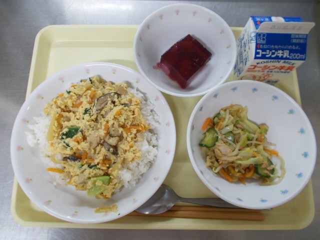 今日の主食+主菜は『親子丼』でした。皆さんのよく食べる親子丼は卵が少し半熟気味でとろっとしているものをイメージすると思いますが、学校給食では厳しい衛生管理基準があり、しっかりと加熱調理しなくてはならないため、親子丼のつくり方も少し異なります。具材を炒めて少し多めのつゆを入れて煮たあとに、でんぷんでとろみをつけてから、卵を入れて煮ることで、卵がふんわりした食感になるように仕上げました。