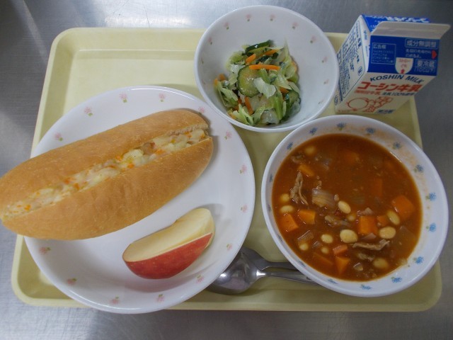 今日の給食の主菜は『ポークビーンズ』でした。ポークビーンズはアメリカの家庭料理のひとつで、豚肉と豆などをトマト味で煮込んだ料理です。本場アメリカでは白インゲン豆を使うことが多いようですが、今日は”大豆”を使って作りました。