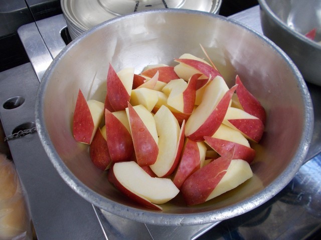 今日は栄養士の実習生が調理作業に加わってくれているので、りんごを飾り切りにしました。りんごの皮にも栄養がたっぷり含まれており、皮まで食べるのがおすすめです。飾り切りするのはとても手間のかかる作業で、いつものりんごの調理より倍くらい時間がかかってしまいましたが、きれいなりんごの皮の赤い色がお皿の上を華やかにしてくれてよかったなと思います。ほとんどの生徒が皮も残さずに食べてくれました。