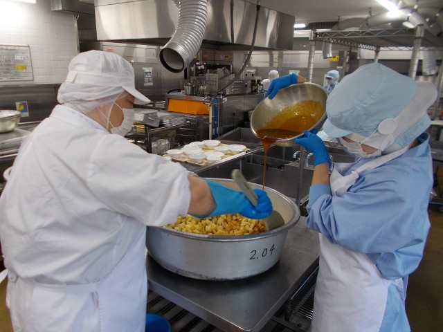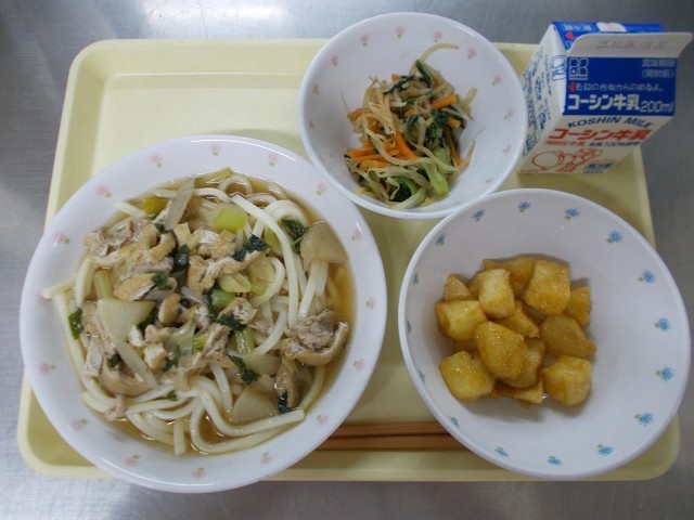 今日の給食の副菜は『コロコロ照りマヨポテト』でした。角切りに切ったじゃがいもにでんぷんをまぶして油で揚げ、塩・しょうゆ・三温糖・マヨネーズ・黒コショウで作ったタレを絡めました。生徒からの評判がとてもよく、おいしかったとたくさんの声をもらいました。