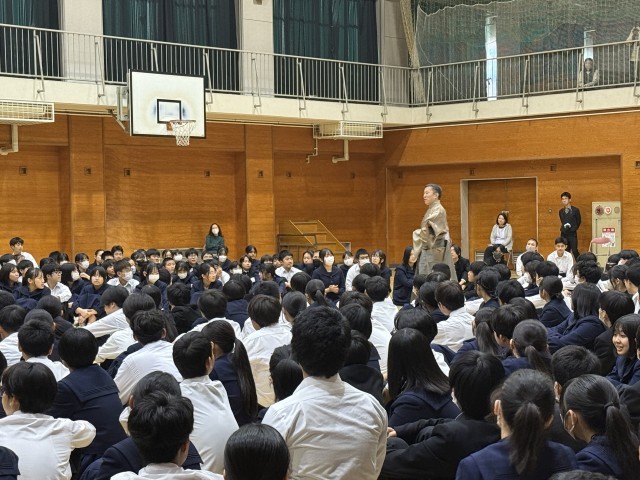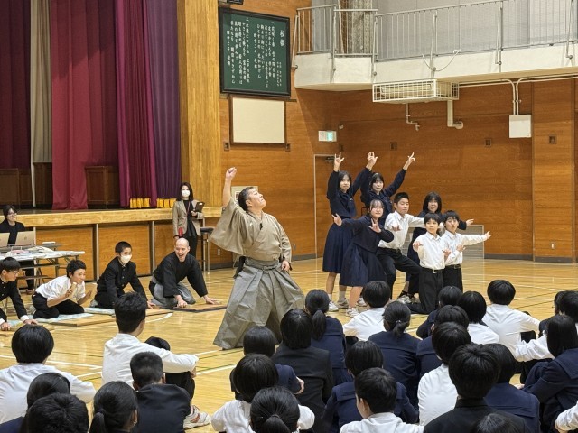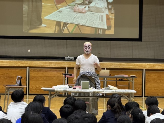 11月14日 芸術鑑賞教室 公開日 2025/11/18 更新日 2025/11/17 できごと 本日は芸術鑑賞教室として歌舞伎役者さんなどをお招きし、歌舞伎についての体験学習を実施しました。歌舞伎役における所作についてを見せていただいたり、生徒を交えて実演も行いました。また、隈取という歌舞伎における化粧も披露してくれました。とても楽しく、そして貴重な体験をすることができました。 いいね(0)