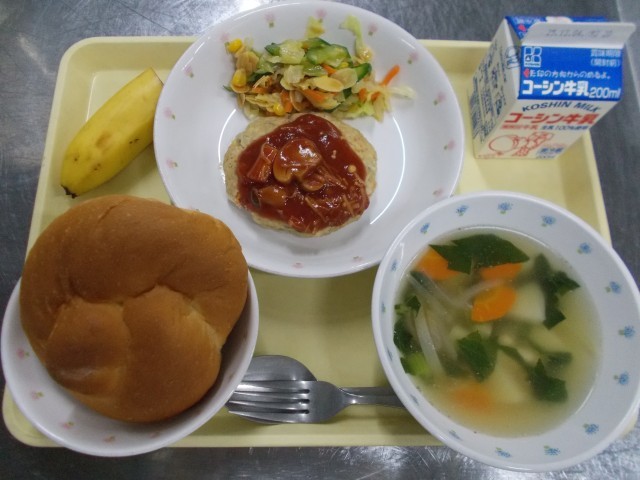 今日の主菜は『ハンバーグきのこソースがけ』でした。ハンバーグは豚ひき肉をベースに、豆腐やみじん切りの大豆・にんじん・ごぼうなども混ぜ込んで作りました。ごぼうが入ることで、ちがう食感が加わります。きのこソースはケチャップをベースにえのき・しめじ・マッシュルームと3種のきのこを使って作りました。きのこのうまみが加わり、ハンバーグとの相性もばっちりでした。