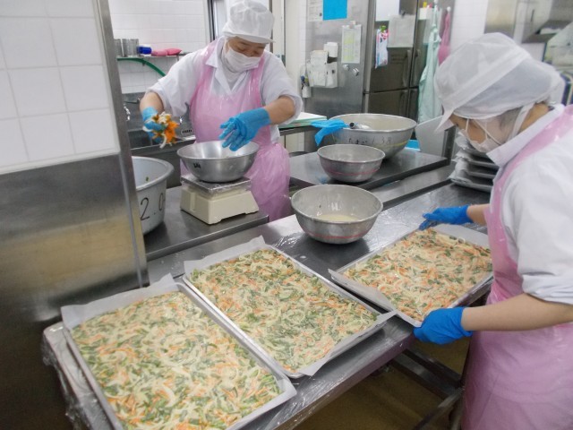 今日の給食には『米粉チヂミ』を出しました。チヂミは韓国の伝統的な料理で、日本のお好み焼きに似ています。チヂミはごま油で薄くカリッと焼き上げるのが特徴です。今日は粉を米粉とでんぷんの2種類を使って作りました。鉄板にごま油を塗ってから生地を流しいれ、焼いている途中でひっくり返してまたごま油を塗ってから焼いてと…工夫して作りました。もちっとした食感に焼きあがり生徒もおいしく食べてくれていました。