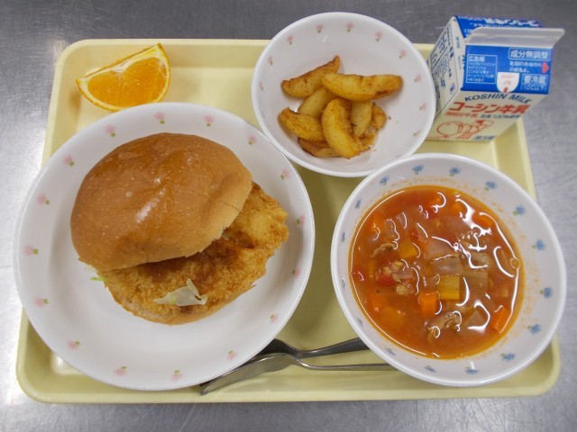 今日の給食の主食+主菜は『フィッシュバーガー』でした。お魚が大きくてパンからはみ出ていてとってもボリュームのあるバーガーでした。