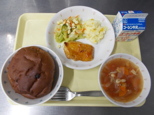 2学期最後の給食はクリスマスイブだったため、クリスマスをイメージした献立でした。ローストチキンは下味をつけた鶏肉を香ばしくオーブンで焼いたあとに、さらに照り焼きのたれを絡めました。