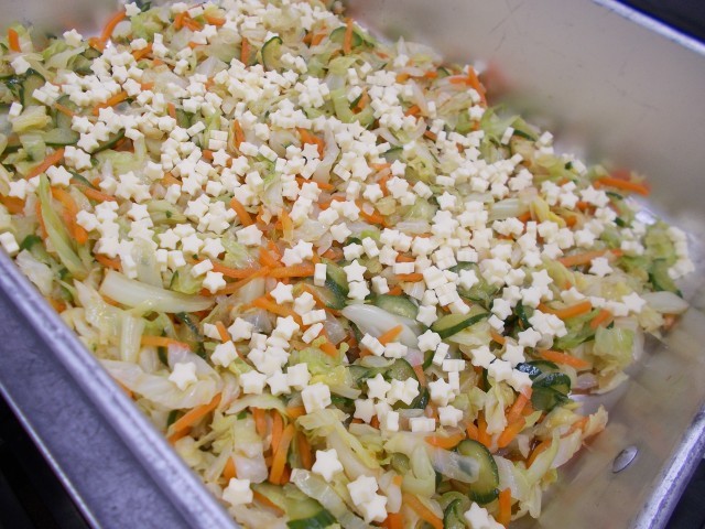 クリスマスサラダは星型のチーズをトッピングしました。最後の給食も食べ残しが少なく、生徒はおいしく食べてくれました。